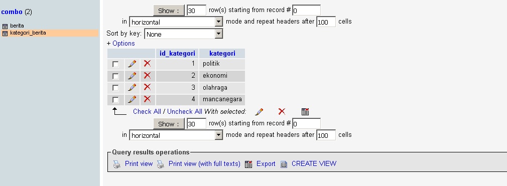 pertama kita buat database combobox. pada database saya saya mengisi dengan 2 tabel yaitu tabel kategori_berita dan tabel berita